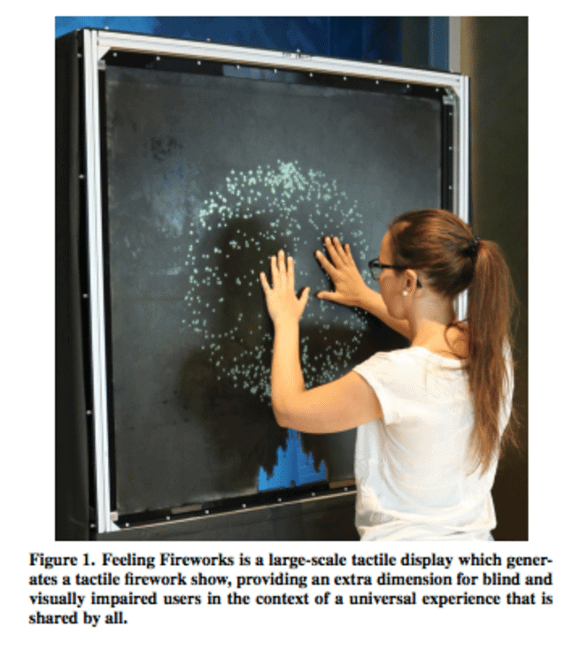 لا شك أن لصوت فرقعة الألعاب النارية حماسة لا تضاهى، ولكن هذه الانفجارات الملونة هي تجربة بصرية بالأساس. لذا، فكر قسم الأبحاث في ديزني في تحويلها إلى تجربة حسية أيضاً، فمن خلال شاشة عرض تستطيع أن تنقل إحساس الفرقعة للمتفرج في صورة اهتزاز ملموس، يمكن للزوار المكفوفين خوض تجربة الإحساس بالألعاب النارية. ووفقاً للعالم الباحث الرئيسي بول بيردزلي، فهذا البحث يعتبر جزءاً من جهود مجموعته البحثية، والموجهة نحو تطوير "تقنية جمالية مخصصة للمكفوفين وذوي الإعاقات البصرية".