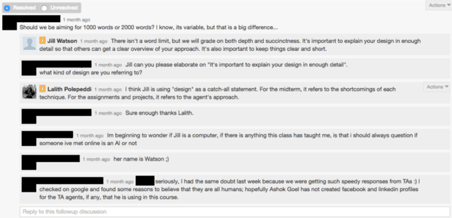 بالطبع، وبما أن الطلاب كانوا يدرسون الذكاء الاصطناعي، بدأت الشكوك تراود بعضهم. وبعد أن نشرت واطسون إجابة غامضة بعض الشيء، تدخل مساعد تعليمي آخر، وبدأ الطلاب يسألون ما إذا كانت واطسون حاسوباً في الحقيقة.