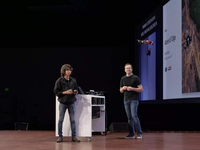 تعمل شركة مايكروسوفت مع شركة دي جي آي العملاقة لصناعة الطائرات بدون طيار، وقدمت عرضاً أمام الجمهور يوضح التداخل بين الذكاء الاصطناعي والمركبات الجوية غير المأهولة. ففي عرض عملي، حلقت طائرة مسيرة من نوع "دي جي آي مافيك إير" في المكان وقامت ببث تسجيل فيديو مباشر على خشبة المسرح لأنابيب تستخدم في القطاع الصناعي مع محاكاة بأنها تعاني خطباً ما؛ ثم قام حاسوب محمول كان يستقبل البث المباشر باستخدام برنامج للذكاء الاصطناعي لتفحّص محتوى الفيديو في الزمن الحقيقي وتحديد الخلل الموجود فيه، مظهراً إياه على الشاشة مع مربع أصفر اللون يحيط به.