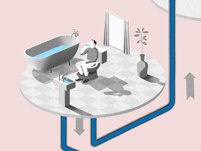 يشكّل الماء 90% من بول الإنسان (والبراز كذلك بمقدار ثلاثة أرباع تقريباً). وفي كل مرة تنظف مرحاضك بضخ الماء، ينقل نظام الصرف الصحي الفضلات وما يتراوح بين 1.6 غالون و7 غالونات من الماء لطردها عبر المرحاض كي تصل إلى محطة مُعالجة مصممَة لجعلها صالحة للشرب.