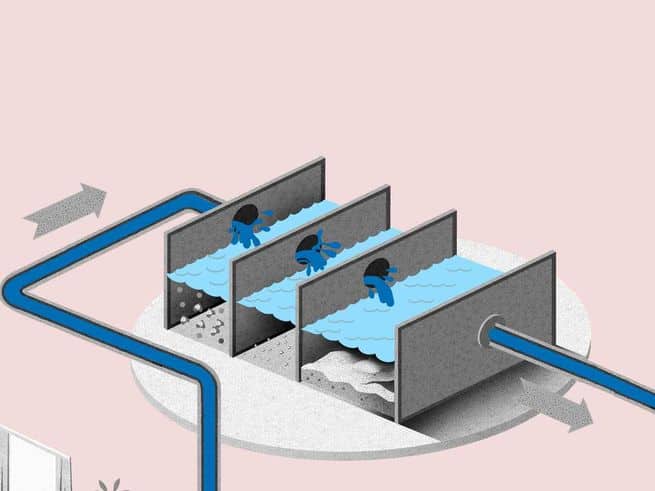 تستخدم محطات المعالجة سلسلة من الحواجز الشبكية لالتقاط الصخور والعصي وغيرها من الفضلات الأكبر حجماً التي قد تشتمل عليها المياه العادمة. أما الفضلات الأقل حجماً فتترسب في قاع المغاطس العميقة، ويتدفق الماء إلى المرحلة الأخرى من المعالجة. وتضيف بعض البلديات أيضاً مواد كيميائية تجمع الفضلات كلها معاً، ما يجعل من الأسهل اصطياد وإزالة البراز العالق.