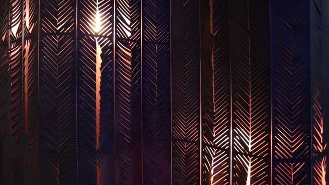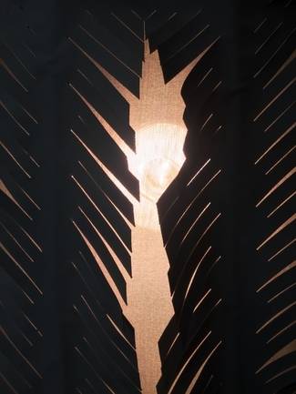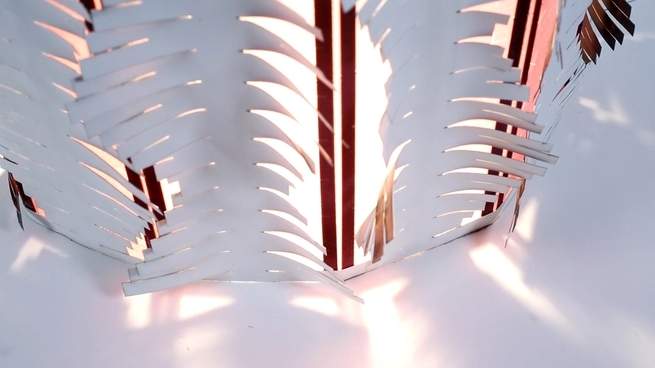 ولكن، على عكس النسيج التقليدي الذي يبقى مكانه بدون حراك، فإن تقطيعات الشيفرون (على شكل حرف V) في النسيج الفعال تفتح وتغلق مع حركة المصابيح. فعند ارتفاع الحرارة قربها، تفتح الخصلات الصغيرة بشكل يشبه سحلية محرشفة تنفخ رقبتها. ومع تراجع الإضاءة، تنكمش الشقوق وكأنها صفوف صغيرة من الجنود وهي تتراص قرب بعضها البعض. ويبدو المنظر بأكمله حساساً وودوداً في نفس الوقت، وكأنه مجموعة من ورق النخيل الذي يتمايل مع الرياح.