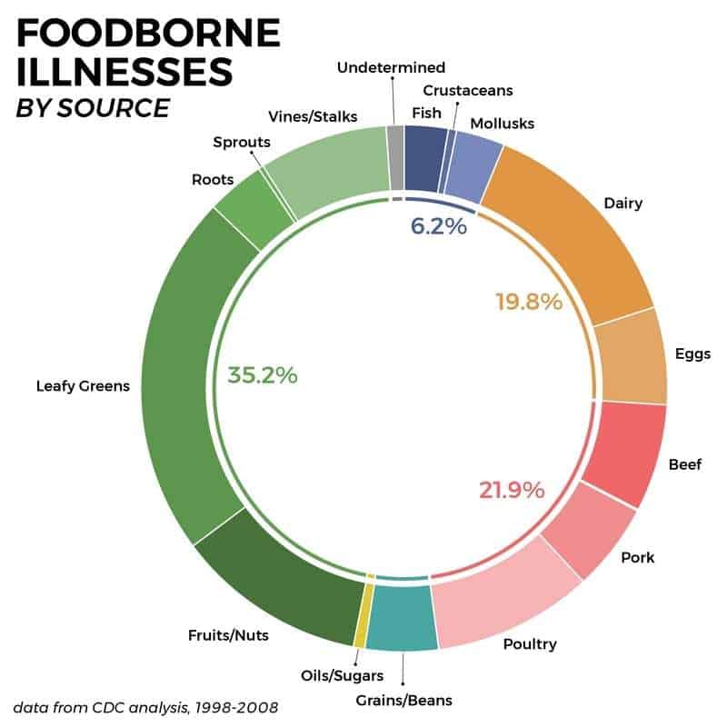وهناك اتجاه مماثل للمحاصيل الطازجة التي تسبب الكثير من الأمراض الأخرى المنقولة بالأغذية. وقد يكون من الصعب أن نقول إن ذلك يعود فقط لتركيز الاهتمام على الجوائح الدورية، خاصة وأن الكثير من الحالات تحدث بشكل متقطع. وقبل بضع سنوات، حدد مركز مكافحة الأمراض الأسباب الجذرية لـِ 120،321 حالة مرضية بين عامي 1998 و 2008، وهذه هي النتائج التي توصل إليها.