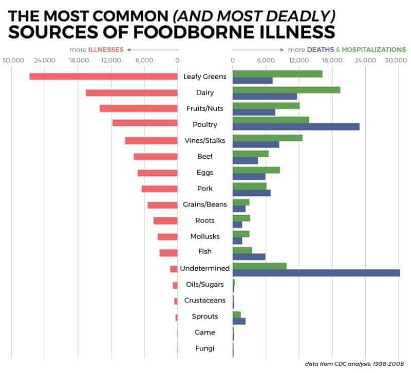إذاً، لا يمكن تحديد الغذاء الأكثر فتكاً، أما مصدر الغذاء المحدد والذي سبب أكبر عدد من الوفيات، فهو لحم الدجاج. ويعود التفاوت في الحالات المرضية مقارنة بالوفيات (أو حتى حالات الاستشفاء) إلى الاختلافات الدقيقة بين أنواع الأمراض التي يسببها كل نوع من أنواع الطعام. وتميل الليستيريا وأنواع معينة من السالمونيلا إلى أن تكون قاتلة، وهذه البكتيريا عموماً تصيب الدواجن، وتسبب المحاصيل الأمراض بنسبة أكبر، ولكن أعراضها تكون غالباً أقل حدة.