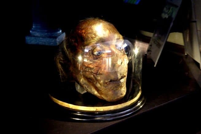 - رغب الفيلسوف الإنجليزي جيريمي بينثام في أن يتم تحنيطه بعد موته، ولكن من سوء الحظ، فإن عملية التحنيط لا تنجح على البشر بشكل جيد؛ ولهذا تم حشو هيكله العظمي أسفل العنق بالقش وإلباسه بملابسه ووضعه في كرسيه المفضل. غير أن عملية التحنيط تركت رأسه فاقداً للون ومن دون تعابير، ولهذا وُضع رأس شمعي فوق عظامه، ومن ثم نُقل الشيء بأكمله -وهو المعروف باسم: الأيقونة الذاتية- إلى خزانة في جامعة لندن، حيث ما زال معروضاً هناك حتى اليوم.