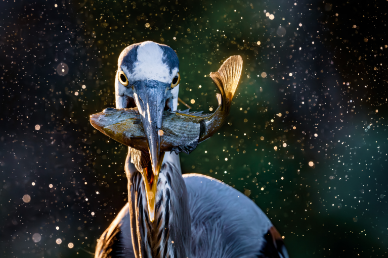 يحب طائر البلشون الأزرق الكبير الصيد عند قاعدة قناة صغيرة لتصريف المياه الفائضة حيث تتجمع الأسماك الكبيرة في المياه المتلاطمة. ومع أن المصور التقط صوراً لطيور البلشون وهي تصطاد الأسماك هنا في مناسبات عديدة، إلا أن شمس الصباح الباكر كانت في الزاوية المناسبة تماماً لإضاءة المياه المتطايرة، ما أضفى على المشهد مظهراً مختلفاً.