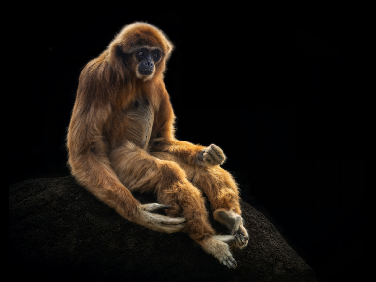 يجلس قرد الجبّون هذا، بنظرة مستغرقة تعلو وجهه، في لحظات من التأمل الهادئ. حيث تكشف تعابير وجهه عن عمق ذكائه وفضوله الذي يميز هذا الكائن الرائع الذي ينتمي إلى الرئيسيات.