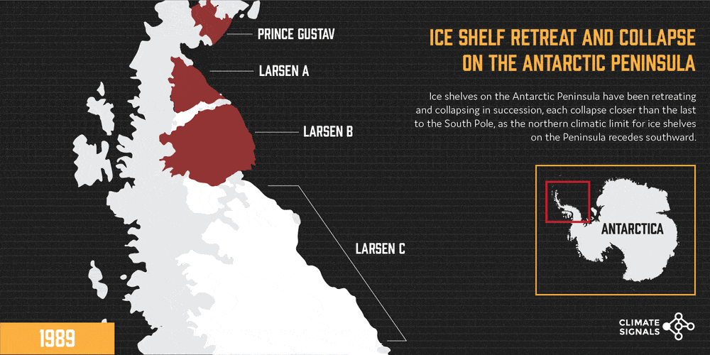 انهار الجرف الجليدي لارسن إي عام 1995، وانهار الجرف لارسن بي بشكل مفاجئ عام 2002 بعد أن حدث تطور لصدع مشابه.