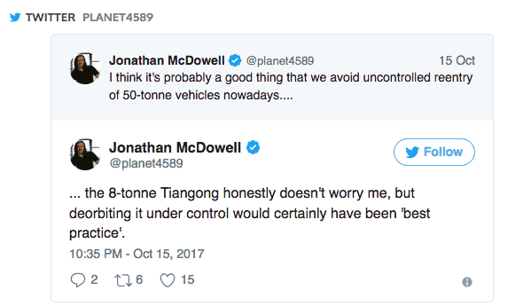 في الأسبوع الماضي، نشرت جريدة "ذي جارديان" مقالة عن جوناثان ماكدويل، وهو عالم فلكي بجامعة هارفارد، والذي توقع أن "تيانجونج-1" ستترك مدارها في أواخر 2017 أو بدايات 2018، وهو التوقع الذي توافق مع التصريح الصيني الرسمي حول الموضوع.