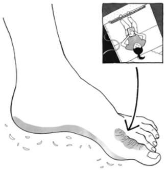 كما أننا نصاب بأعراض "الأقدام المتحرشفة" على الجزء العلوي من أصابع قدمينا، لذا نربط أقدامنا باستمرار تحت قضيب معدني، وأحزمة وحبال، ونستخدم هذه القوة لنثبت أنفسنا، وللمحافظة على وضعية أجسامنا بشكل مستقر أثناء العمل. إن هذا القدر من التعرض للاحتكاك كفيل بأن يجعل الجلد عند السطح العلوي لأصابع أقدامنا خشناً ومتحرشفاً للغاية. حتى أن وكالة الفضاء الأوروبية قامت في الواقع بإجراء تجارب تضمنت استخدام جوارب مصممة بشكل خاص، في محاولة منها لمنع الإصابة بهذه الحالة، حيث توفر هذه الجوارب طبقة من المطاط الطري فوق السطح العلوي لأصابع القدمين، وهو حل مساعد بالفعل إلى حد ما.