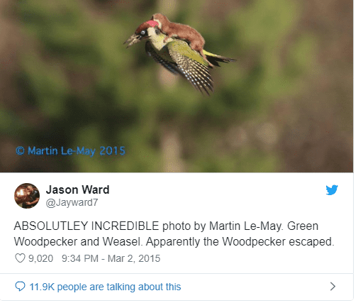 صورة مذهلة التقطها مارتن لو ماي، نقار خشب أخضر وابن عرس. من الواضح أن نقار الخشب نفذ بريشه!
