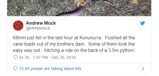 هطلت الأمطار في بلدة كونونورا في أستراليا بمقدار 68 ملليلتر في غضون الساعة الماضية فقط. جرفت هذه المياه جميع علاجيم القصب خارج خزّان مياه إخوتي، وبعض هذه الضفادع اختارت أسهل الطرق للخروج: اعتلاء ظهر ثعبان طوله 3.5 متر.