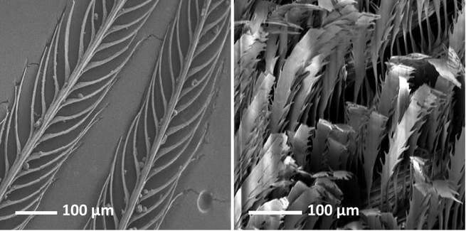 الريش الطبيعي مسطح، ويبدو وكأنه كسيرات؛ وعند التكبير باستخدام المجهر، يبدو كل فرع من الريشة يشبه ريشة صغيرة مسطحة. وتحت المجهر الإلكتروني، كنا مندهشين لرؤية أن الريش شديد السواد يشبه الشعاب المرجانية المصغرة، أو فرشاة تنظيف العبوات الزجاجية، أو الأشجار ذات الأوراق المرتبطة ببعضها ضمن حزم محكمة.