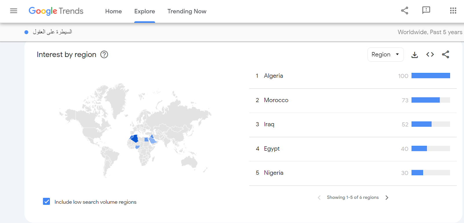 وبالنسبة لترتيب الدول العربية التي تبحث عن مصطلح "السيطرة على العقول" وفقاً لجوجل تريندز آخر 5 سنوات، فهي كما يلي:
