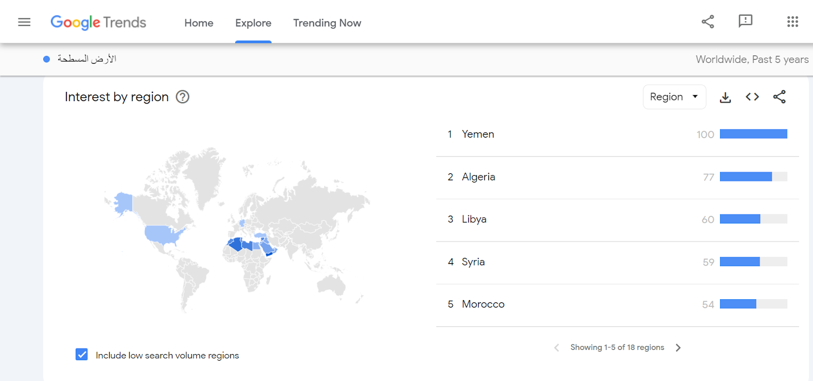 هناك نسبة جيدة من الأشخاص في العالم العربي يصدقون نظرية الأرض المسطحة، والسبب في ذلك يعود إلى تفسيرات بعض النصوص الدينية الموجودة في الكتب الدينية المقدسة. ووفقاً لنتائج البحث عبر جوجل تريندز آخر 5 سنوات وحتى لحظة إعداد التقرير، تبين أن أكثر 10 بلدان تبحث عن مصطلح "الأرض المسطحة" كانت بالترتيب التالي: