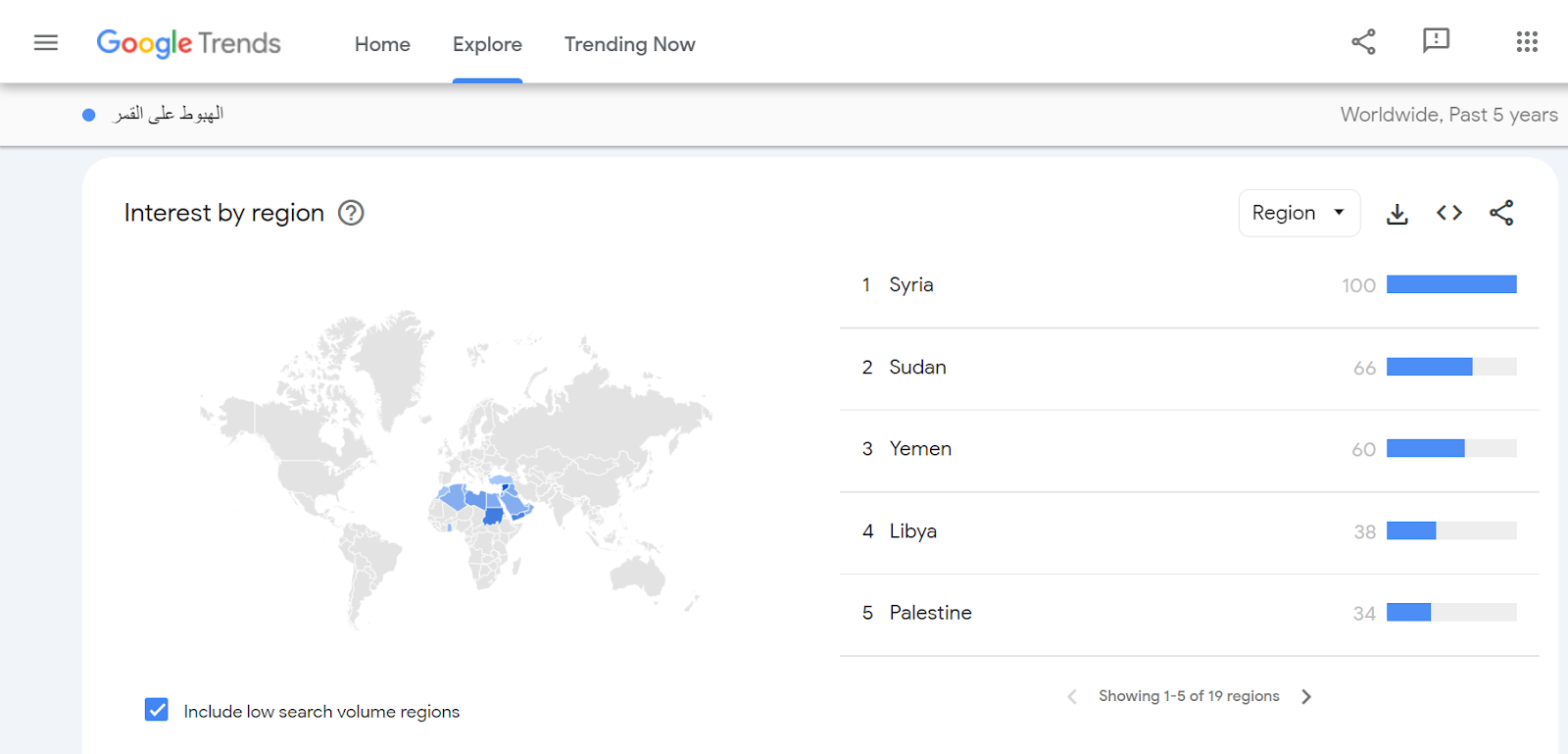 أمّا بالنسبة لترتيب البلدان العربية التي بحثت عن مصطلح الهبوط على سطح القمر وفق جوجل تريندز آخر 5 سنوات حتى إعداد هذا التقرير، كان كالتالي: