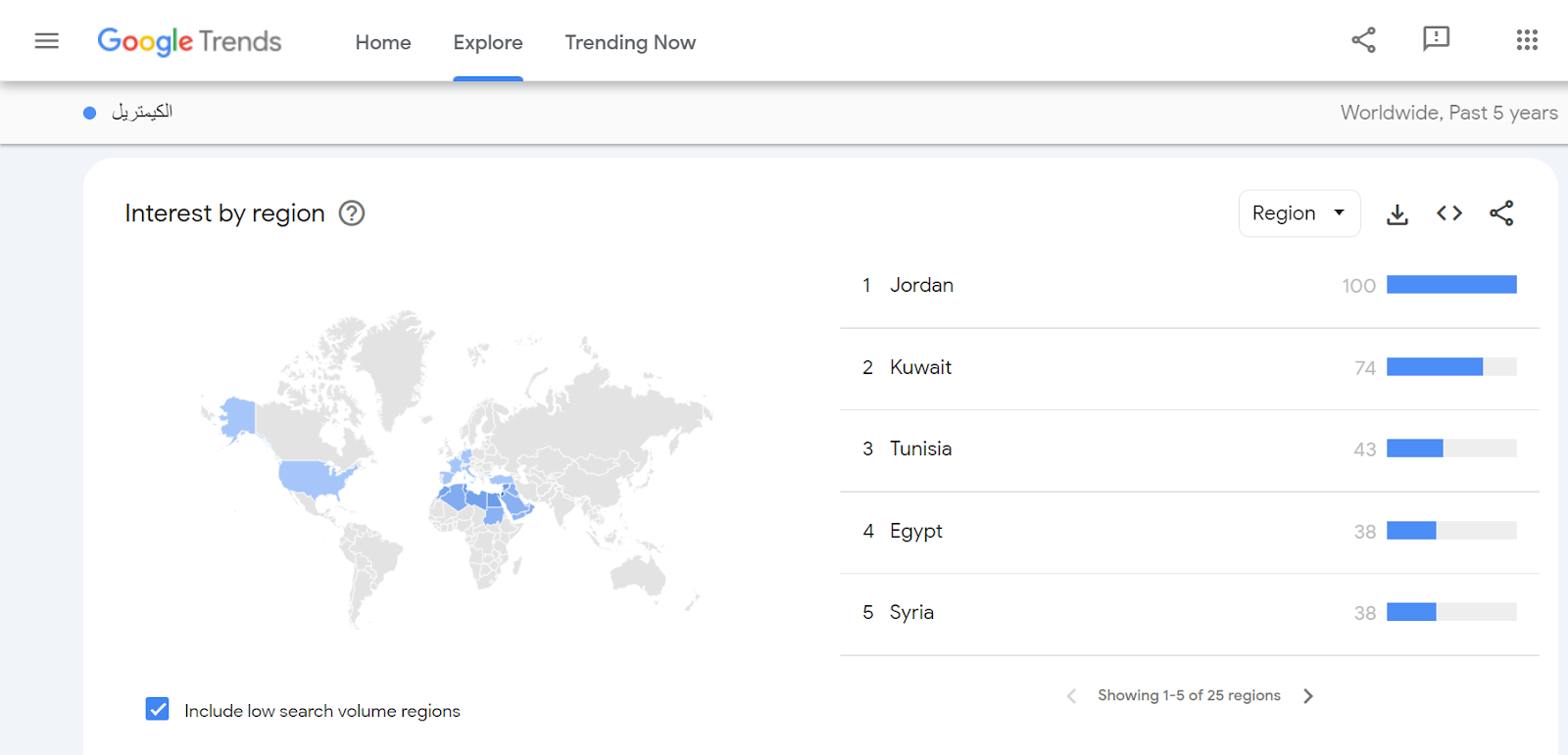 وفقاً لجوجل تريندز آخر 5 سنوات كان ترتيب الدول العربية التي تبحث عن مصطلح "كيمتريل" وفق ما يلي: