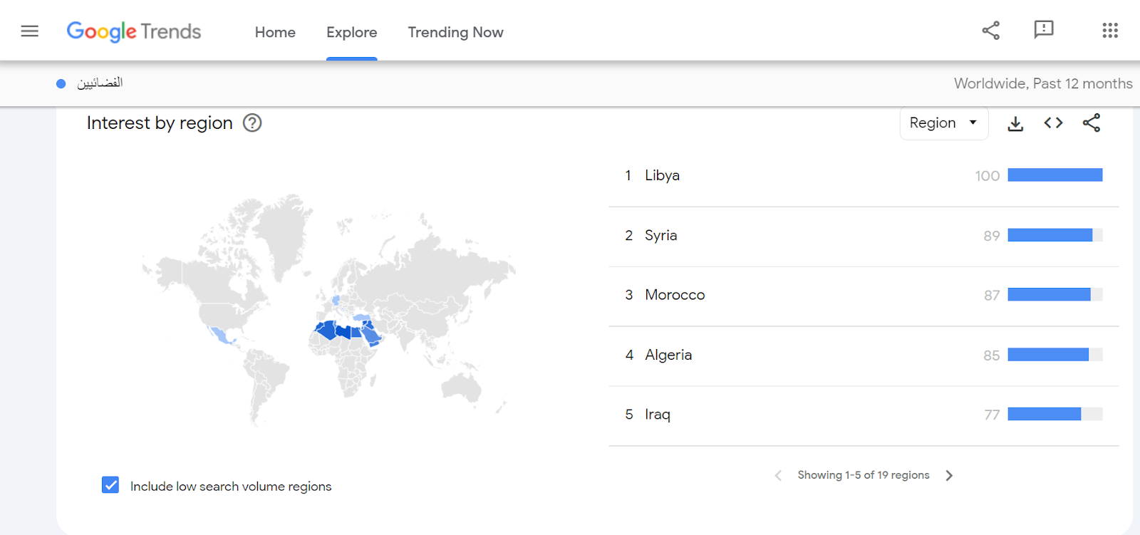أمّا بالنسبة لترتيب الدول العربية التي تبحث عن كلمة "الفضائيين" وفق جوجل تريندز خلال آخر سنة من إعداد هذا التقرير، فهو كالتالي