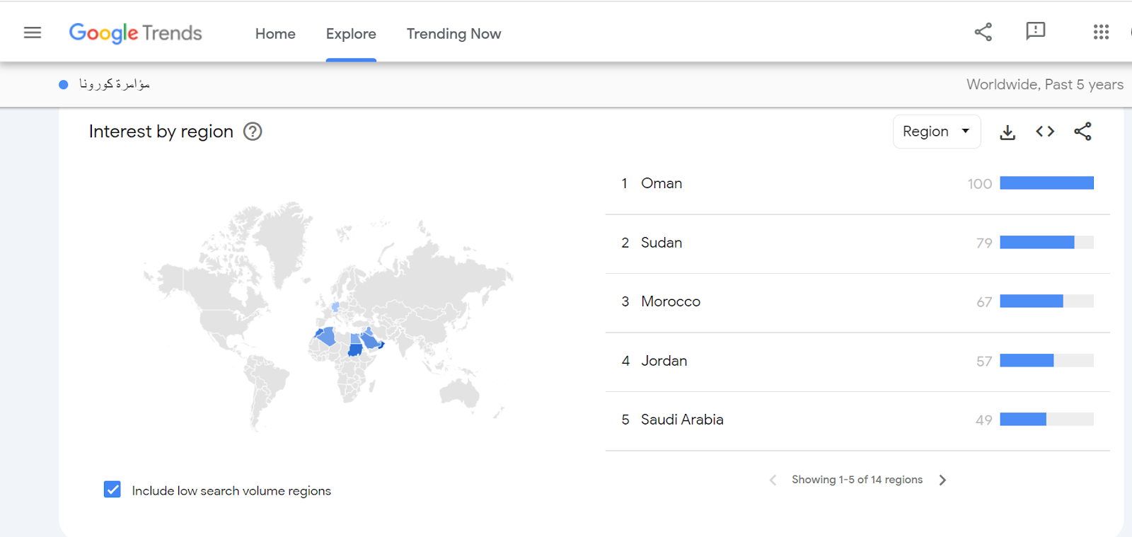وترتيب الدول العربية التي تبحث عن "مؤامرة كورونا" وفق جوجل تريندز آخر 5 سنوات كما يلي: