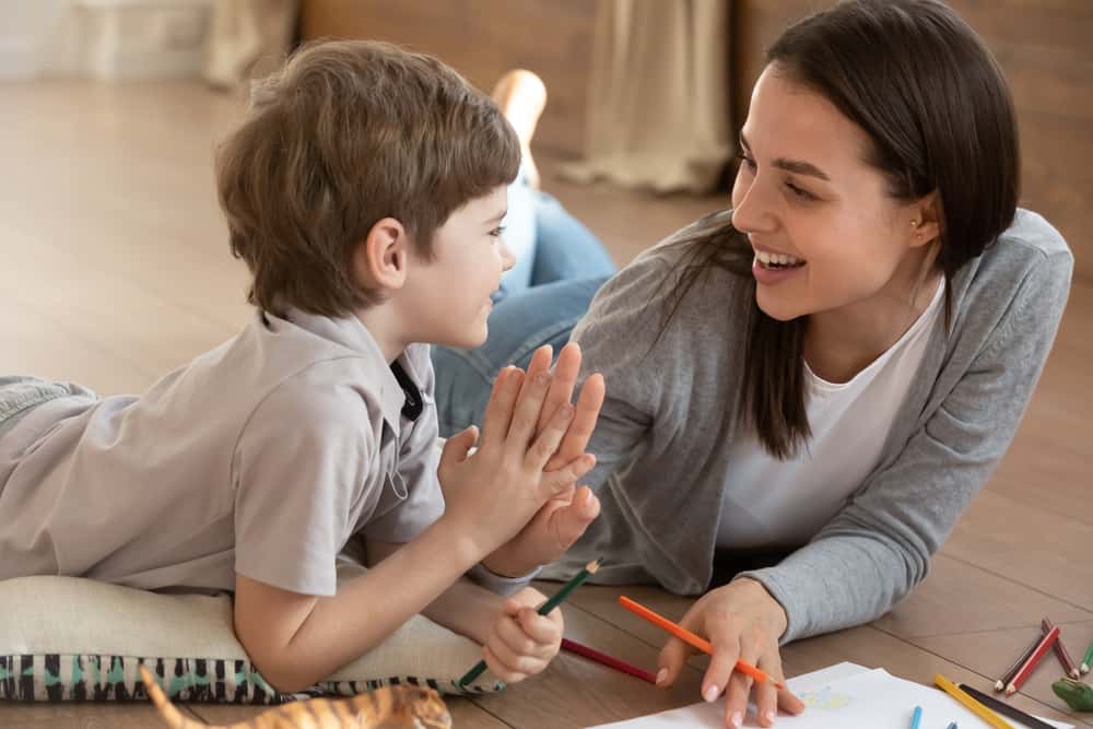 استمتع بالتحدث مع طفلك، وأظهر له مدى سعادتك بحديثكما. ابتسم له وعزز رغبته في التواصل معك، وعندما ينهي حديثه قل له: «رائع، من الجميل أنك أخبرتني بذلك، أحب الاستماع إلى قصصك، أو أنا سعيد بك.»