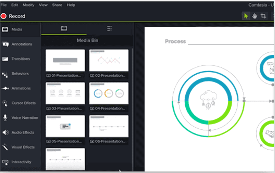 يسمح برنامج Camtasia بتسجيل الصوت والفيديو من سطح المكتب. يتمتع بميزة السحب والإفلات لإضافة تأثيرات. يوفر مكتبة من الموسيقى والمؤثرات الصوتية بدون حقوق ملكية. ويتيح إمكانية إضافة العنوان والتعليقات التوضيحية والتأثيرات. ومن ميزاته أنه يمكّنك من إضافة صور متحركة إلى تسجيلات الشاشة. بالإضافة إلى استيراد شرائح البرامج التقديمية (البوربوينت) مباشرة إلى برنامج Camtasia. ما يجعل هذا البرنامج مثالياً للشركات والمعلمين ورجال الأعمال.