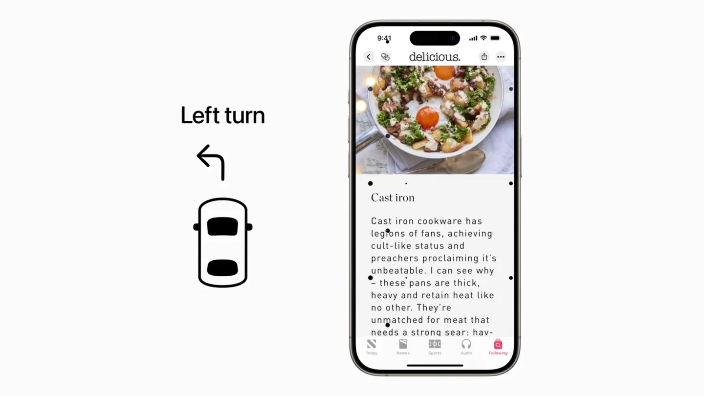 تقول آبل: "تبين الأبحاث أن دوار الحركة يحدث عادة بسبب تباين حسي بين ما يراه الشخص وما يشعر به، ما قد يمنع البعض من استخدام أجهزة آيفون أو آيباد على نحو مريح في أثناء ركوب مركبة متحركة. في ميزة إشارات حركة المركبة، تمثل النقاط المتحركة على حواف الشاشة التغيرات في حركة السيارة للمساعدة على تخفيف هذا التباين الحسي دون التأثير في المحتوى الرئيسي للشاشة".
