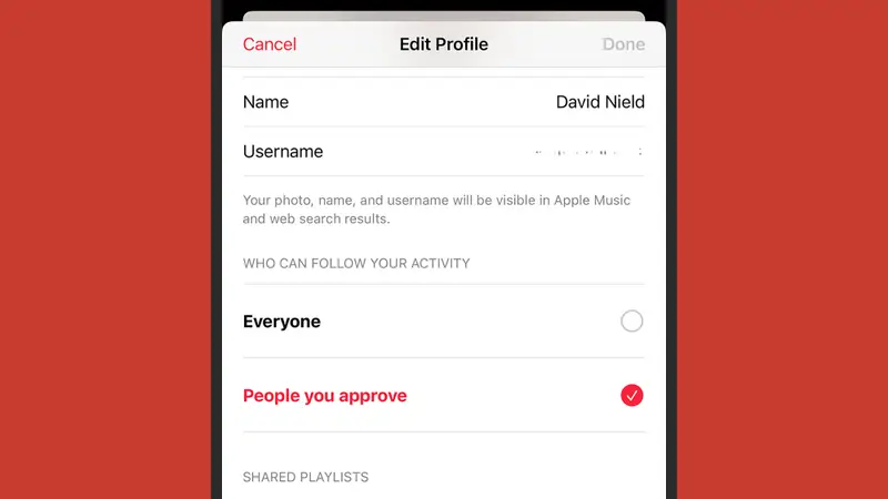 يحتوي الملف الشخصي في تطبيق آبل ميوزك على خيار يتيح للمستخدمين متابعة بعضهم. ستتمكن في صفحة التعديل نفسها أيضاً من السماح للجميع (Everyone) بمتابعتك دون موافقة، أو فقط للأشخاص الذين توافق عليهم (People you approve) باستخدام مربعات الاختيار ذات الصلة. سيتمكن متابعوك من رؤية المزيد من التفاصيل حول الأغاني التي تستمتع إليها إلى جانب قوائم التشغيل المشاركة. يمكنك إيقاف هذه المشاركة التفصيلية للأغاني في الملف الشخصي من خلال إيقاف تشغيل مفتاح التبديل باسم "الاستماع إلى" (Listening To) في صفحة التعديل.