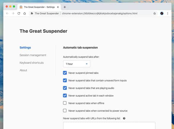 في جوجل كروم (وإيدج أيضاً الذي يدعم نفس الإضافات) يمكن أن تفي إضافة «إكس تاب» بالغرض. كما يمكن استخدام الإضافات التالية: «ذا جريت سسبندر»، و«تاب رانجلِر» على كلا المتصفحين. تقوم هذه الإضافات بعملٍ رائع من خلال إغلاق أو تعليق علامات التبويب غير المستخدمة. بالنسبة لمستخدمي متصفّح سفاري، فإن إضافة «ذا جريت سسبندر» تفي بالغرض، بينما يمكن لمستخدمي متصفّح أوبرا استخدام إضافة «ناين تيبس».