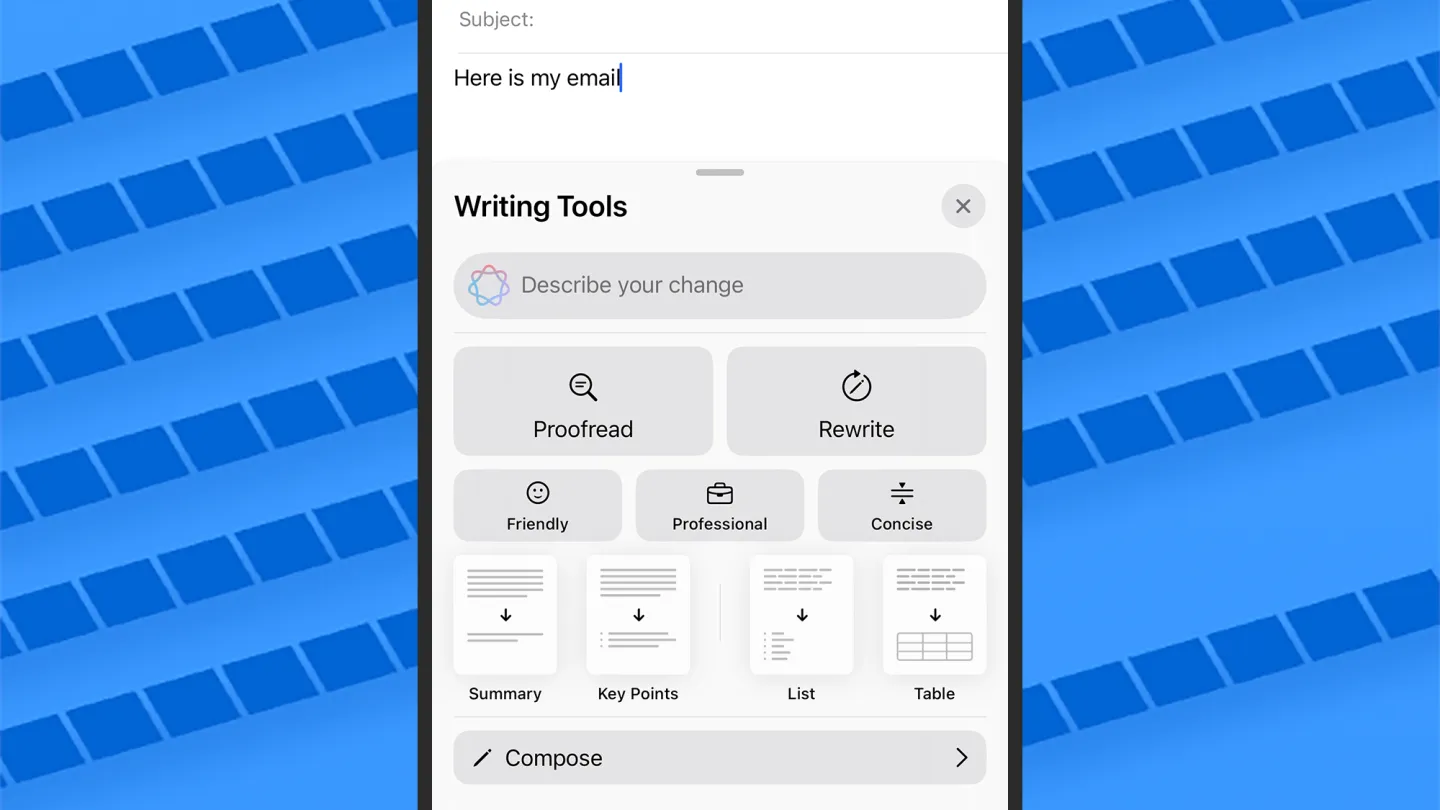 على جهاز الآيفون أو الآيباد، اضغط مطولاً داخل صفحة الرسالة الإلكترونية، ثم اختر "أدوات الكتابة" (Writing Tools) لإظهار خياراتك: يمكنك جعل الذكاء الاصطناعي يراجع ما كتبته ويدققه أو يعيد كتابة ما كتبته، أو جعل أسلوب الخطاب أكثر ودية أو احترافية. يمكنك أيضاً أن تصف التغييرات في مربع الإدخال فقط، أو اختيار "إنشاء" (Compose) لجعل تشات جي بي تي يُنشئ بعض النصوص. وثمة خيار آخر يتيح لك تلخيص نصك الحالي.