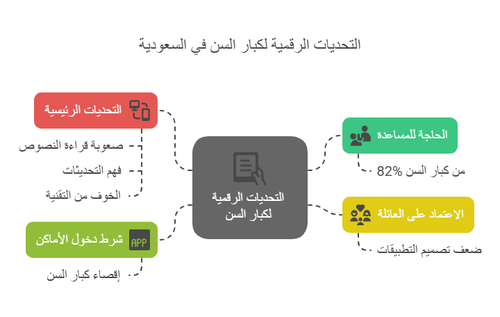 • أبرز التحديات: صعوبة في قراءة النصوص، وفهم التحديثات، والخوف من التقنية.