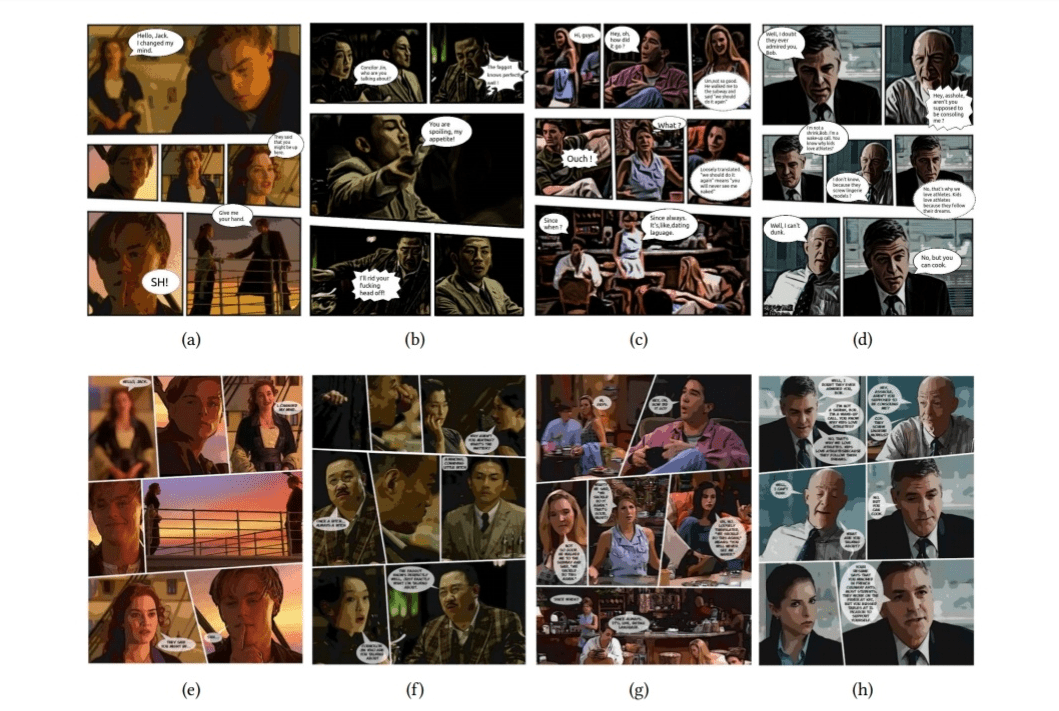 بعد استخراج الإطارات الرئيسية من مقاطع الفيديو وتحويلها إلى صور مرسومة بأسلوب فكاهي، يستخدم النظام الذي ابتكره الباحثون إطاراً تخطيطياُ متعدد الصفحات لنشر الصور عبر عدة صفحات وإنشاء تخطيطات جذابة بصرياً تعكس العلاقة بين الصور.