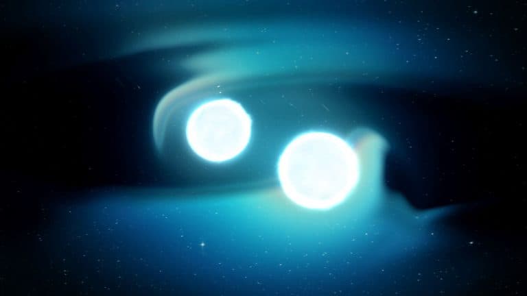 رسم توضيحي يُظهر نجمين نيوترونيين في طريقهما لتصادم كارثي. ناسا