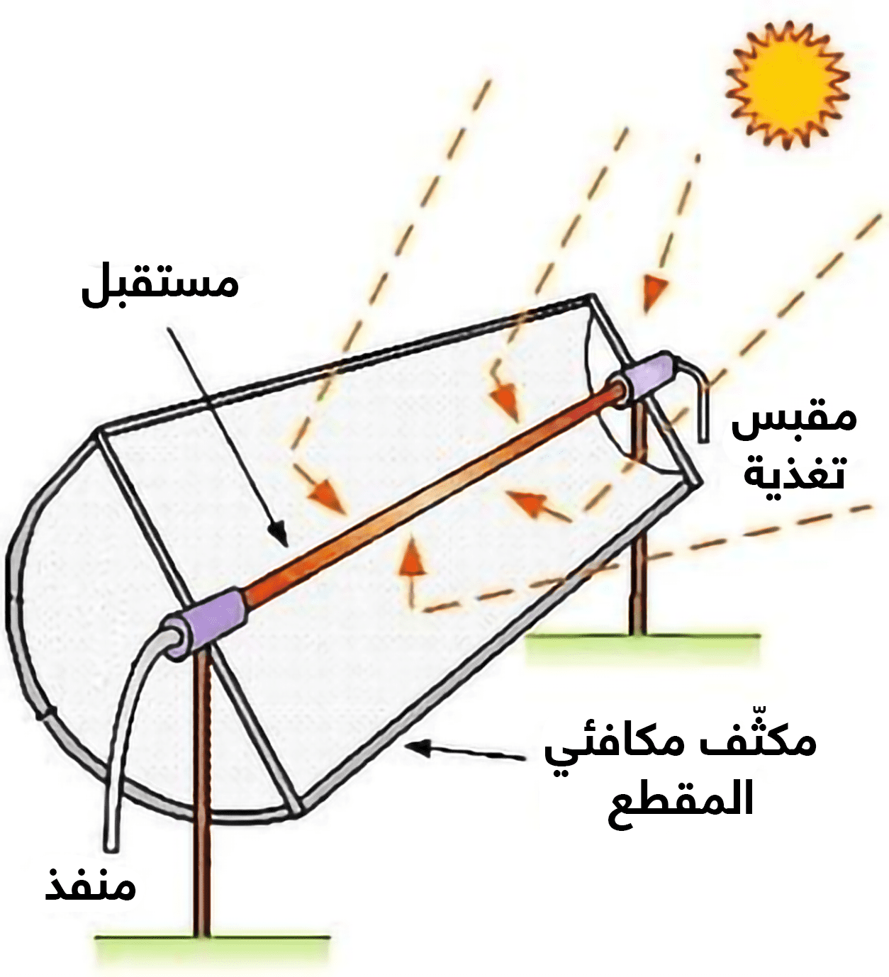 تعكس المرايا مكافئية المقطع أشعة الشمس على أنبوب مليء بالسائل الذي يجمّع ويخزن الحرارة.