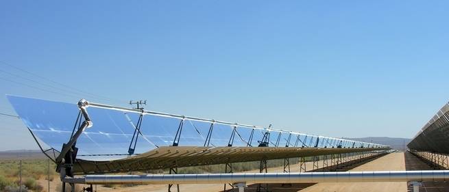 مرايا مكافئية المقاطع في محطة كهربائية تعمل بالطاقة الحرارية الشمسية في كرامر جنكشن في ولاية كاليفورنيا. تحتوي الأنابيب الظاهرة في الصورة على سائل يمكنه امتصاص الحرارة ونقلها.
