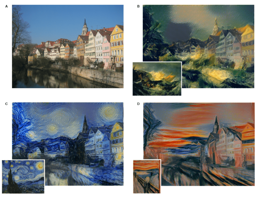 تمكنت المشاريع المتعلقة باللوحات الفنية – وهي جزء من بحث في مجال الذكاء الصناعي يسمى "نقل الأسلوب" – من محاكاة وتطبيق تقنيات كبار الرسامين بنجاح باهر. حيث تمكن الباحثون في بحث أجراه مختبر بيثجي في ألمانيا من تطبيق أساليب الرسم لبيكاسو، وفان غوغ، وفاسيلي كاندينسكي، وإدوارد مونش، على مجموعة من الصور الرقمية. ولتحقيق هذا، استخدموا خوارزميات التعرف على الأجسام لتجاهل الأشياء المرسومة في اللوحات، وذلك للتركيز على كيفية رسمها. وبهذا، تمكنوا من الفصل ما بين المحتوى والأسوب، ودراسة كل منهما بشكل أدق.