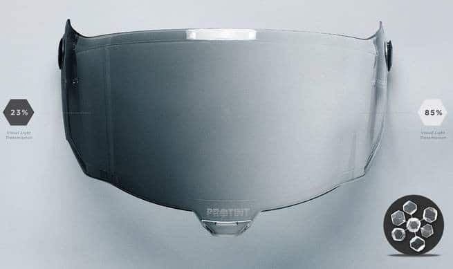من مزايا هذه العدسات مقارنة بزجاج السيارة الأمامي هو أنه تمت هندستها حتى تحجب كافة مكونات الأشعة فوق البنفسجية القادمة من ضوء الشمس. ففي السيارات الحديثة يبقى زجاج السيارة الأمامي غير معتم بغض النظر عن كمية الضوء التي تصله، لكن لا يحدث المثل بالنسبة لسائقي الدراجات النارية.