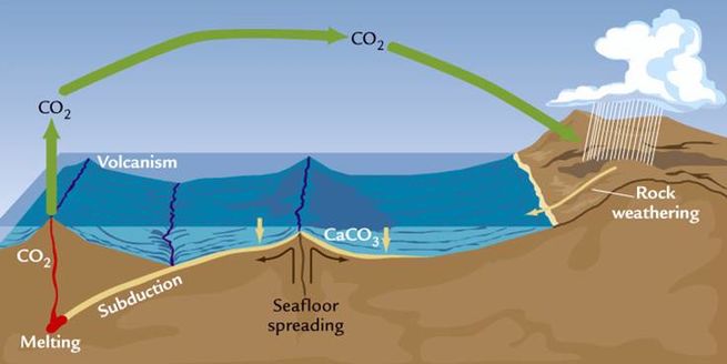 تقوم عمليات الطقس بسحب ثنائي أوكسيد الكربون من الغلاف الجوي إلى المحيطات، حيث يتحد مع الكالسيوم لتشكيل الحجر الجيري. ومن ثم يسحب الحجر الجيري إلى ما تحت قشرة الأرض بسبب حركة الصفائح التكتونية في عملية تعرف باسم الانغراز. تفصل الحرارة ثنائي أوكسيد الكربون عن الحجر الجيري، ومن ثم يقذف الكربون إلى الغلاف الجوي عن طريق الانفجارات البركانية.
