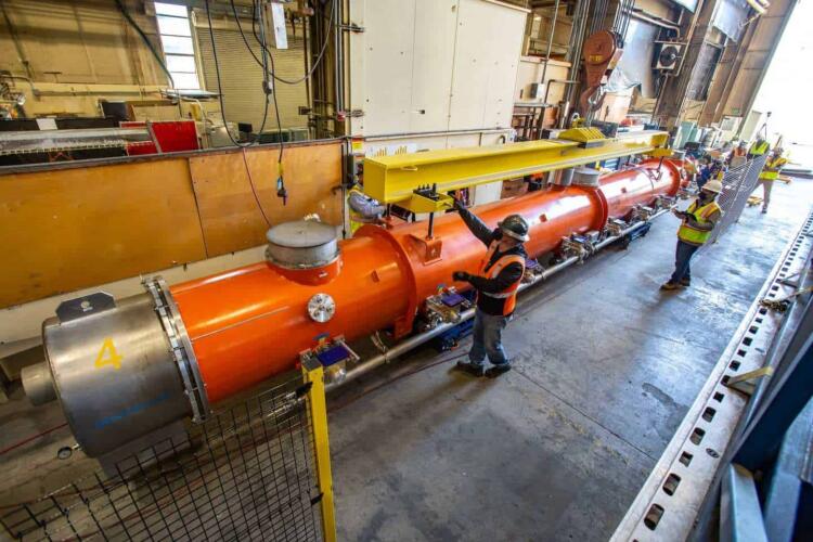وحدة التبريد يتم توصيلها إلى مركز المسرّع الخطي في جامعة ستانفورد لاستخدامها في جهاز حزم الأشعة السينية المعززة. جاكلين رامسيير أورل/مخبر المسّرع الوطني في مركز المسرّع الخطي التابع لجامعة ستانفورد