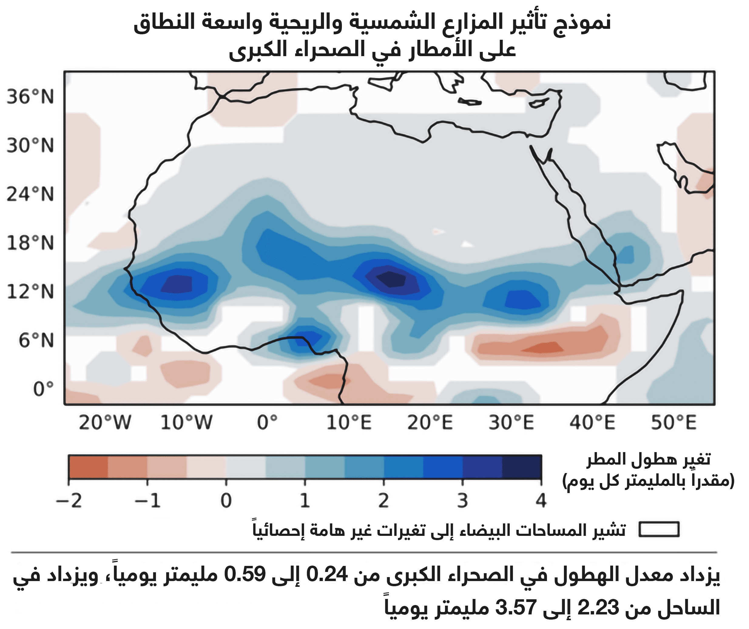 ولكن ما مقدار هذا الاخضرار بالضبط؟ حيث تمتد الصحراء الكبرى على مساحة 9.2 مليون كيلومتر مربع، وقد نفَّذ الباحثون في الدراسة عمليات محاكاة على نماذج حاسوبية تتضمن توزيع توربينات الرياح عبر الصحراء بفاصل 1.6 كيلومتر تقريباً بين كل اثنين، وتغطية 20% من الصحراء بالألواح الشمسية بتوزيعات مختلفة (مثل نمط لوح الشطرنج أو على شكل أرباع دائرة)؛ فأدَّت نسب التغطية الصغيرة إلى تأثيرات مناخية ضعيفة (أي ضَعُف تزايد هطول المطر)، غير أن مواقع التوربينات والألواح الشمسية كانت ذات تأثير واضح أيضاً، فمثلاً كان تركيب الألواح الشمسية في المنطقة الشمالية الغربية أكثر تأثيراً من المناطق الثلاثة الباقية.