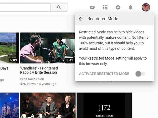 قبل أن تقوم بإعداد القيود على حسابك الخاص على يوتيوب، فكِّر في الكيفية التي تستخدمه بها أنت وأولادك. هل تعتمد على متصفح الويب بشكل رئيسي في المشاهدة؟ في تلك الحالة، انقر على الصورة الرمزية الخاصة بحسابك في الزاوية اليمنى من الأعلى وانقر بالترتيب على الخيارين الوضع المقيد > تفعيل الوضع المقيد. هذا الإعداد يقوم بحظر جميع الفيديوهات "التي يُحتمل أنها تتضمن محتوى موجهاً للبالغين"... ولكن مفعوله يسري فقط من أجل الحساب الحالي للمتصفح، مما يعني أنه يمكن للأولاد أن يتجنبوه من خلال فتح نافذة التصفح المتخفي (incognito window). لذا فإن هذا الوضع يشكِّل حلاً سريعاً وسهلاً، ولكنه ليس الخيار الأكثر ديمومة أو موثوقية.