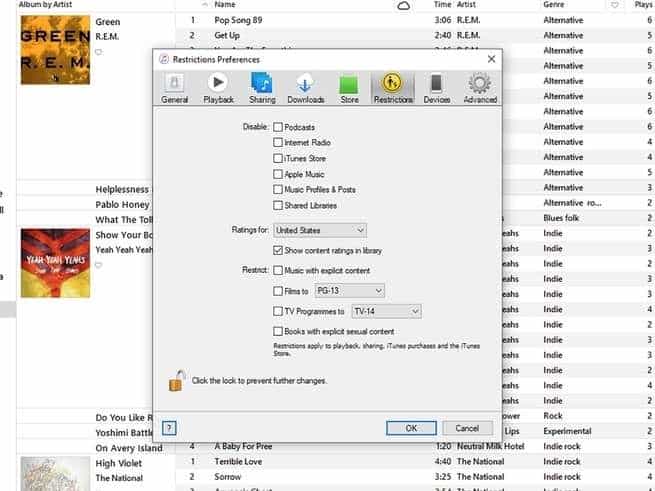 إذا كنت على حاسوب شخصي أو جهاز ماك، فافتح القائمة "تحرير" (على ويندوز)، أو قائمة "آي تيونز" (على ماك أو إس)، ثم انقر على "التفضيلات"، وانتقل إلى علامة التبويب "قيود". وفي هذه الصفحة يمكنك أن تفرض قيوداً على كل من الموسيقى والأفلام وبرامج التلفزيون والكتب نفسها (بناءً على مستوى النضج العمري)، أو أن تعطل مكونات التطبيق بالكامل، مثل متجر آي تيونز والتدوينات الصوتية.