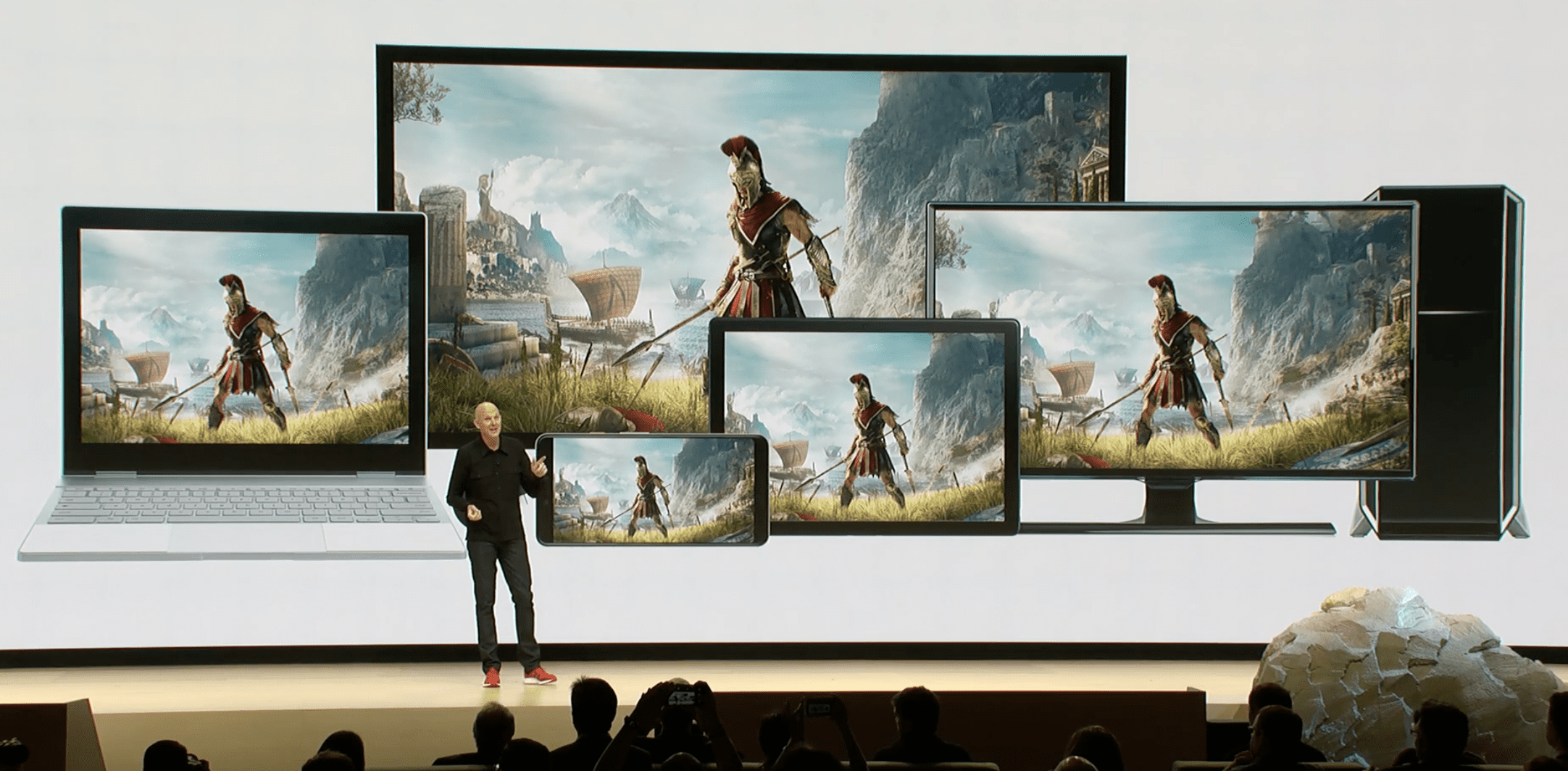 يبدأ عرض جوجل التقديمي الأول بمشاهد تعود للعبة "franchise Assasin's Creed"، ويظهر فيها مستخدمٌ يشاهد مقطعاً دعائياً لتلك اللعبة على اليوتيوب ثم يضغط على زر "العبplay " الذي يظهر في مقطع اليوتيوب، وبمجرد ضغط ذلك الزر ينتقل الشخص للعب فعلياً في خمس ثوانٍ بفضل خدمة البث السحابي، أي لا يتوجب عليك تثبيت أو تحميل أي شيء.
