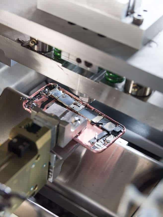وفي نهاية خط التفكيك، تجمع الشركة بعض الأجزاء معاً وفق المواد التي تخطط لاسترجاعها منها. فالكاميرا واللوحة الالكترونية الرئيسية، على سبيل المثال، تتضمن النحاس والمعادن الثمينة مثل الذهب والفضة والبلاديوم.
