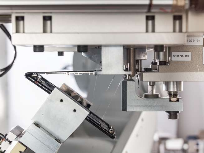 تستخدم ذراع الروبوت أداة وتدية لخلع الشاشة من الهيكل وما تبقى من مكونات الهاتف.