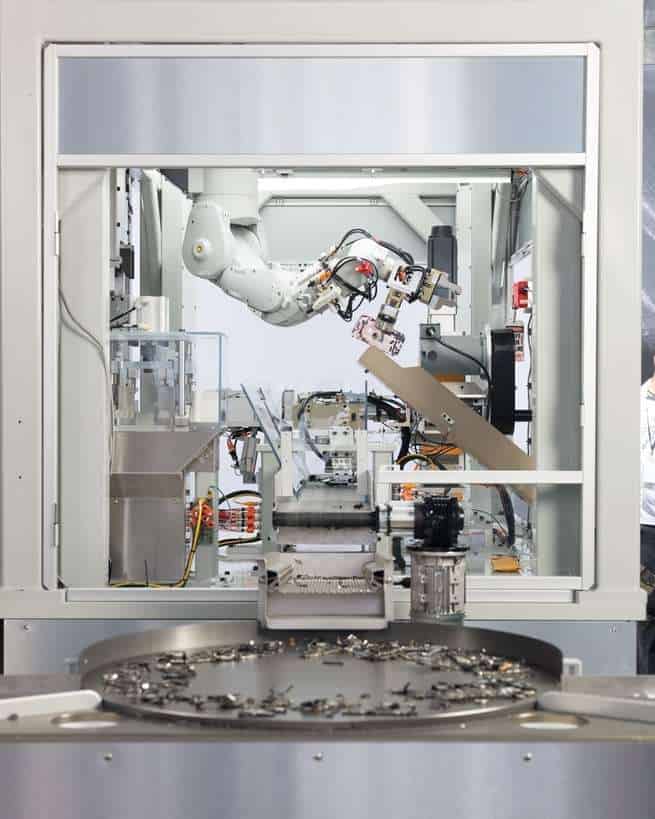 تسقط الهواتف من الحاوية العليا إلى حزام ناقل حيث تتعرف كاميرا متصلة بالحاسوب على الأجهزة وتحلل اتجاهها. من ثم تلتقط ذراع آلية الهواتف -تلتقط فقط الأجهزة التي يتجه وجهها نحو الأسفل، في حين تعود الهواتف التي يتجه وجهها نحو الأعلى لتبدأ الدورة من جديد- لتبدأ عملية التفكيك الصناعي.