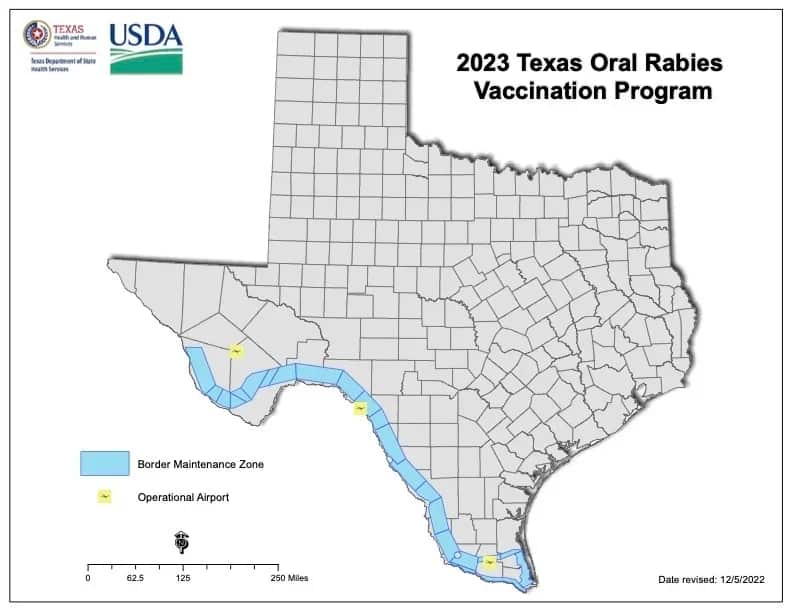 بدأت إدارة الخدمات الصحية في ولاية تكساس الشهر الماضي في إسقاط طعوم لقاحات فموية ضد داء الكلب على طول الحدود الجنوبية. حيث يهدف برنامج التطعيم الفموي ضد داء الكلب في الولاية إلى حماية مجموعات الحيوانات البرية، خاصةً الثعالب والذئاب البرية، في المنطقة من الإصابة بهذا المرض القاتل أو نقل العدوى.