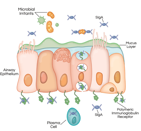 تتعرّض الرئتين باستمرار للبكتيريا وأشكال المهيجات الأخرى، وفي نفس الوقت، تقوم بمهمة إدخال الأكسجين إلى مجرى الدم، لذلك لا يمكن أن يكون لها حاجزٌ مادي يحميها مثل الجلد. لذلك طورت الرئتين نظاماً دفاعياً متعدد الجوانب، حيث يحتوي هذا النظام بشكلٍ أساسي على الأجسام المضادة التي تُدعى الغلوبولين المناعي الإفرازي، والذي يلعب دوراً مهماً في الوظيفة المناعية للأغشية المخاطية في الرئتين ويمنع البكتريا من غزوها. لا يقتل الغلوبولين المناعي الميكروبات بشكلٍ مباشر، وإنما يمنعها من إثارة استجابةٍ مناعية عالية قبل أن يتخلّص منها الجسم عبر آلياتٍ دفاعيةٍ أخرى.
