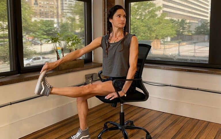 تمرين كرسي المكتب هذا يقوّي عضلات الفخذ ويمدد عضلات بطن الساق (بطّات الأرجل) وينشّط مركز الجسم (المنطقة أسفل الجذع مع الورك) بنفس الوقت. ستحصل على تدريب كامل للجزء السفلي من الجسم دون النهوض من الكرسي.