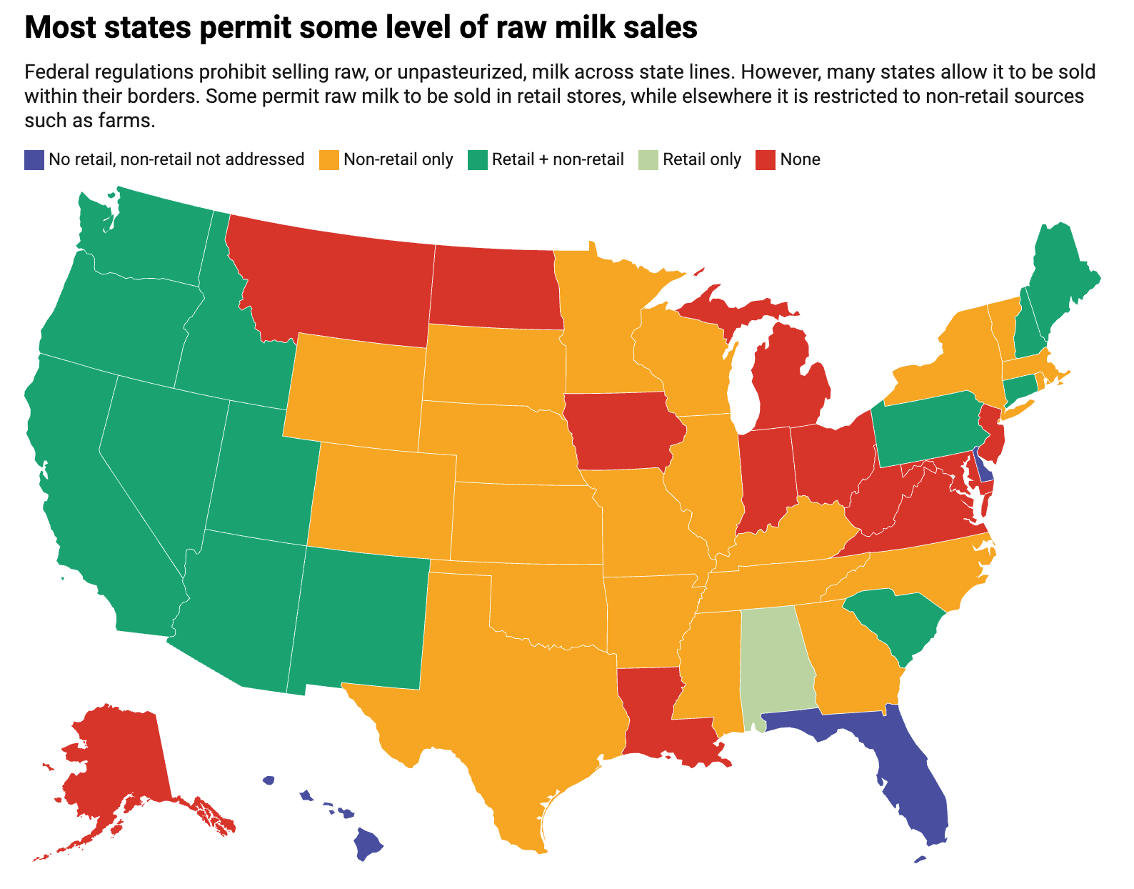 تشمل مصادر الحليب المختلفة عن مصادر البيع بالتجزئة المزارع التي تبيع الحليب للزبائن وتلك التي تسلّمه إلى العملاء مباشرة، ويمكن أن يُستخدم الحليب الخام على أنه علف تجاري. الخريطة: ذا كونفرنسيشن، حقوق الملكية الفكرية المشتركة (CC BY). المصدر: حقائق عن الحليب الخام، احصل على البيانات ونزّل الصورة التي أُنشئت عبر داتا رابر (Datawrapper).