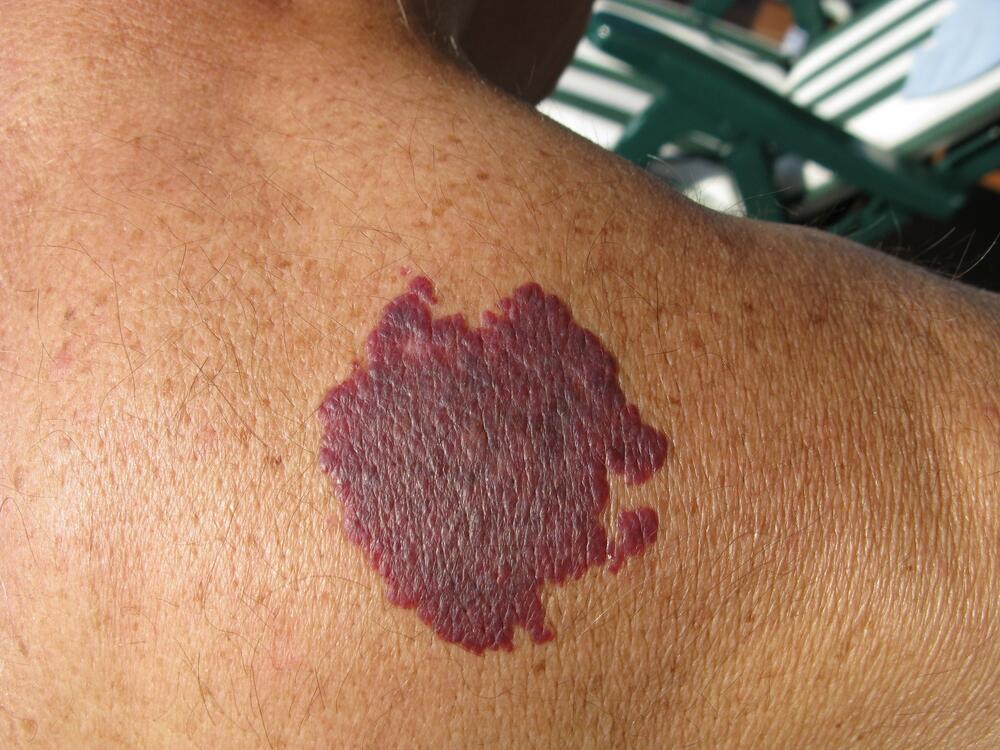 - البقع الخمرية: هي بقع مسطحة ذات لون أرجواني محمر، وهي دائمة يغمق لونها بمرور الوقت، وقد تزداد سماكة، تظهر هذه البقع عادة في الوجه بأحجام مختلفة، لذا عادة ما تؤثر بشكل واضح في الهيئة العامة والثقة في النفس.